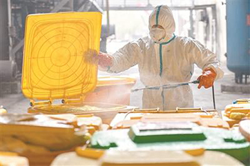 新冠肺炎疫情發(fā)生后,每天產(chǎn)生的巨量醫(yī)療廢物成為武漢市亟待解決的重要問題。圖為近日,在武漢市青山區(qū)云峰公司,工作人員在對醫(yī)療廢物轉(zhuǎn)運箱消毒。新華社記者 才揚 攝3月11日,記者從國務(wù)院聯(lián)防聯(lián)控機(jī)制新聞發(fā)